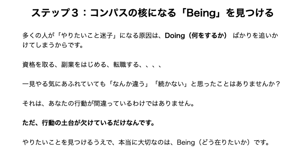 表面的な“好き”“興味”ではなく、あなたの内側に眠っている「どう生きたいか(Being)」を見つけるガイドです。